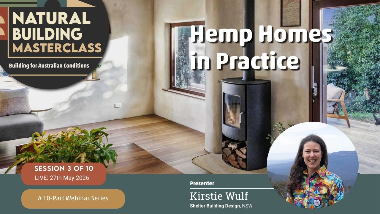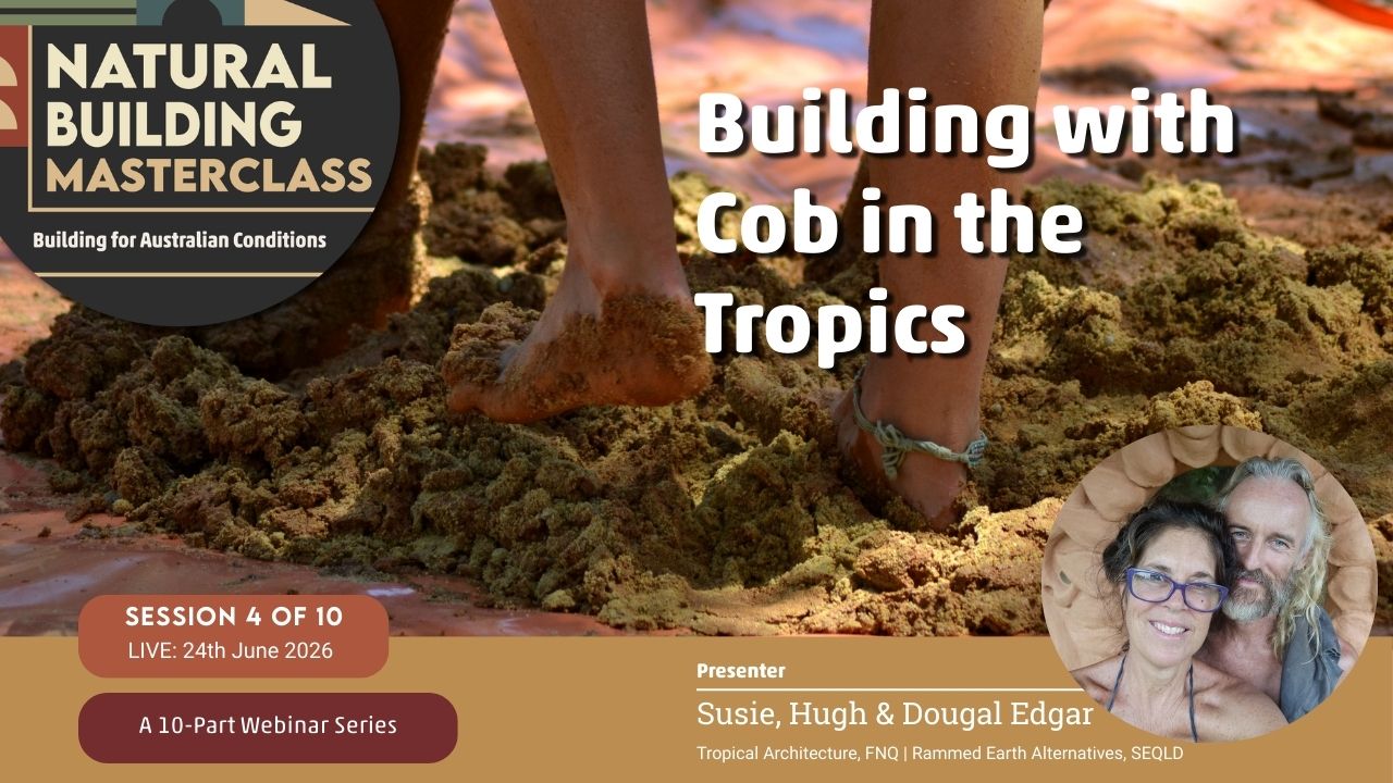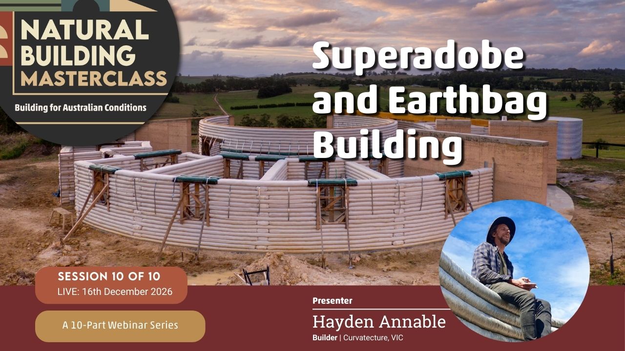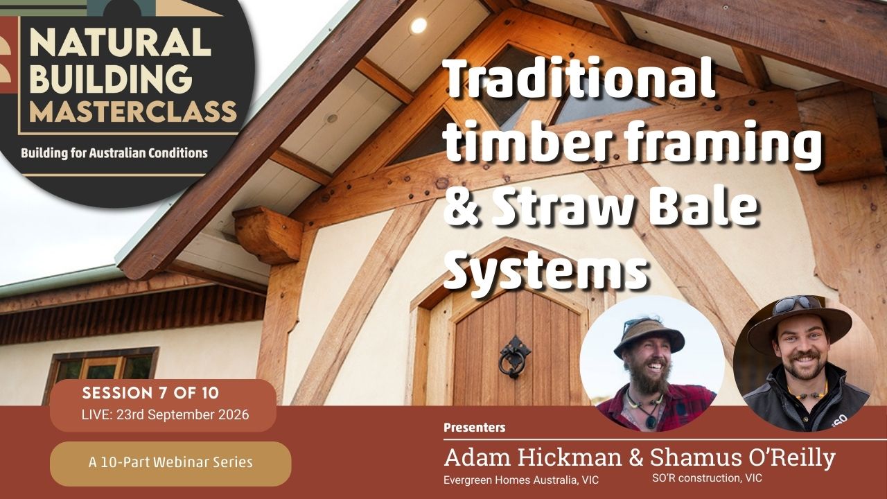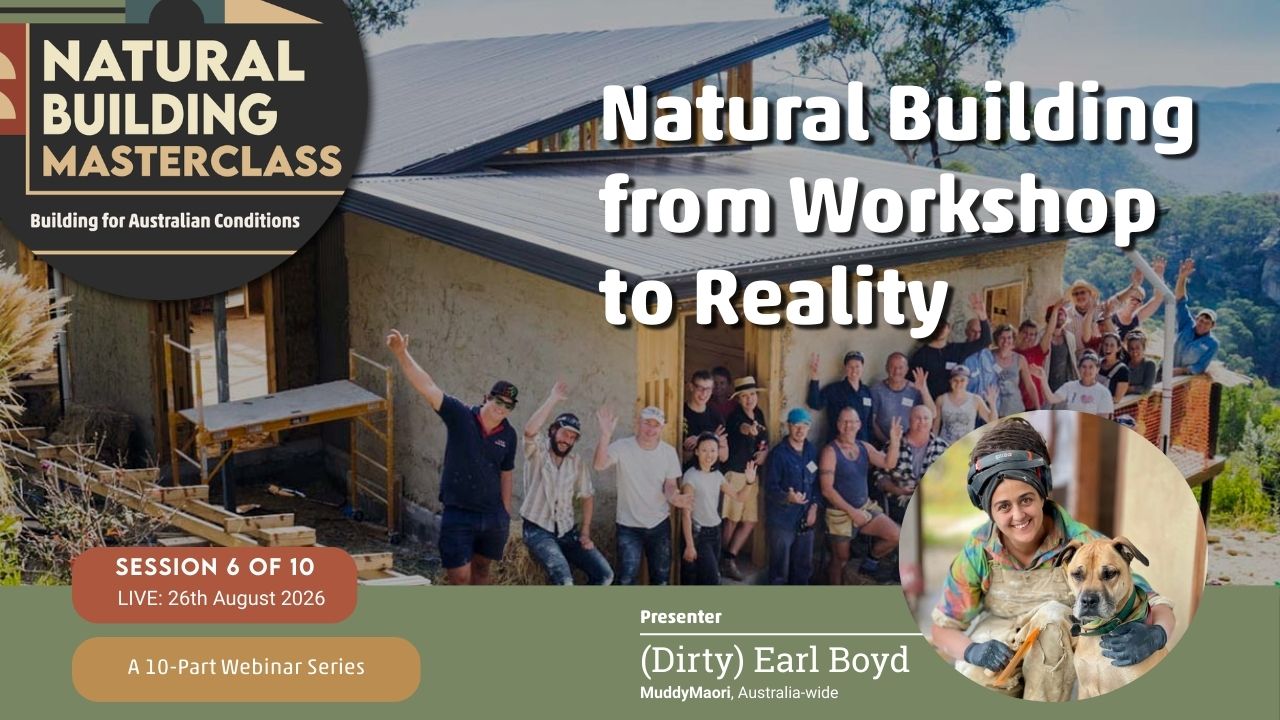The Natural Building Masterclass: Building for Australian Conditions — is a monthly online learning series bringing together experienced Australian natural builders, designers, and practitioners.